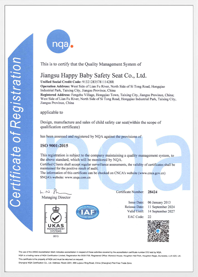Trong lĩnh vực an toàn du lịch cho trẻ em, sự phát triển của các tiêu chuẩn thể hiện sự hiểu biết sâu sắc hơn của con người về khoa học đời sống. CÔNG TY TNHH GHẾ AN TOÀN CHO BÉ JIANGSU HAPPY tin tưởng chắc chắn rằng ghế an toàn cho trẻ em không chỉ đơn thuần là một bộ tiêu chuẩn hay chứng nhận mà còn là trách nhiệm và cam kết. Là người giám hộ đáng tin cậy của các gia đình trên toàn thế giới, chúng tôi hiểu rằng sự ra đời của mỗi chiếc ghế là sự thấu hiểu gia đình và sự tôn trọng cuộc sống.